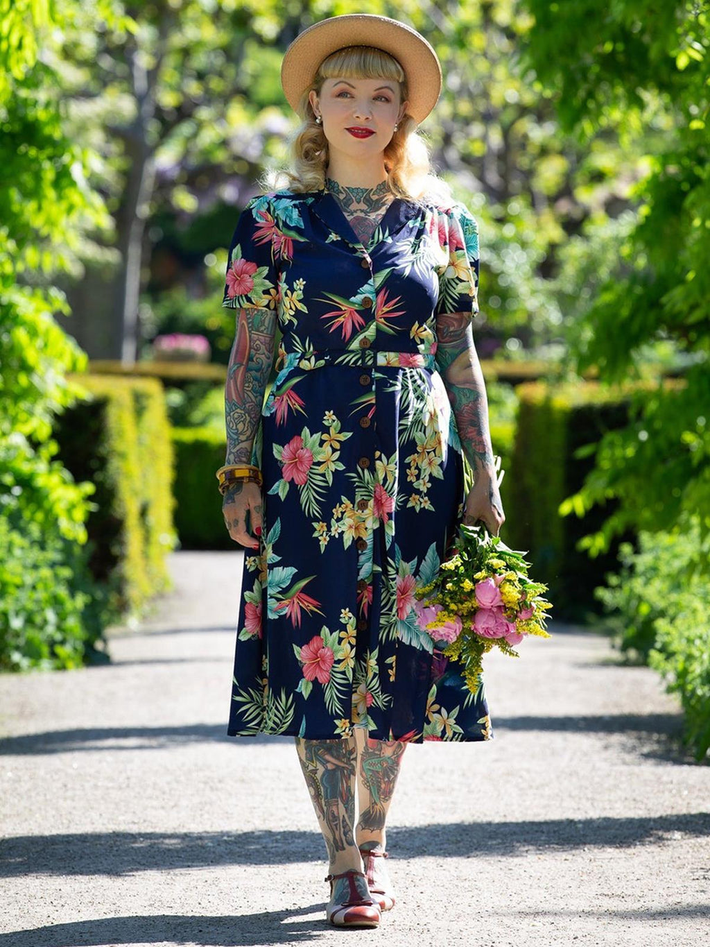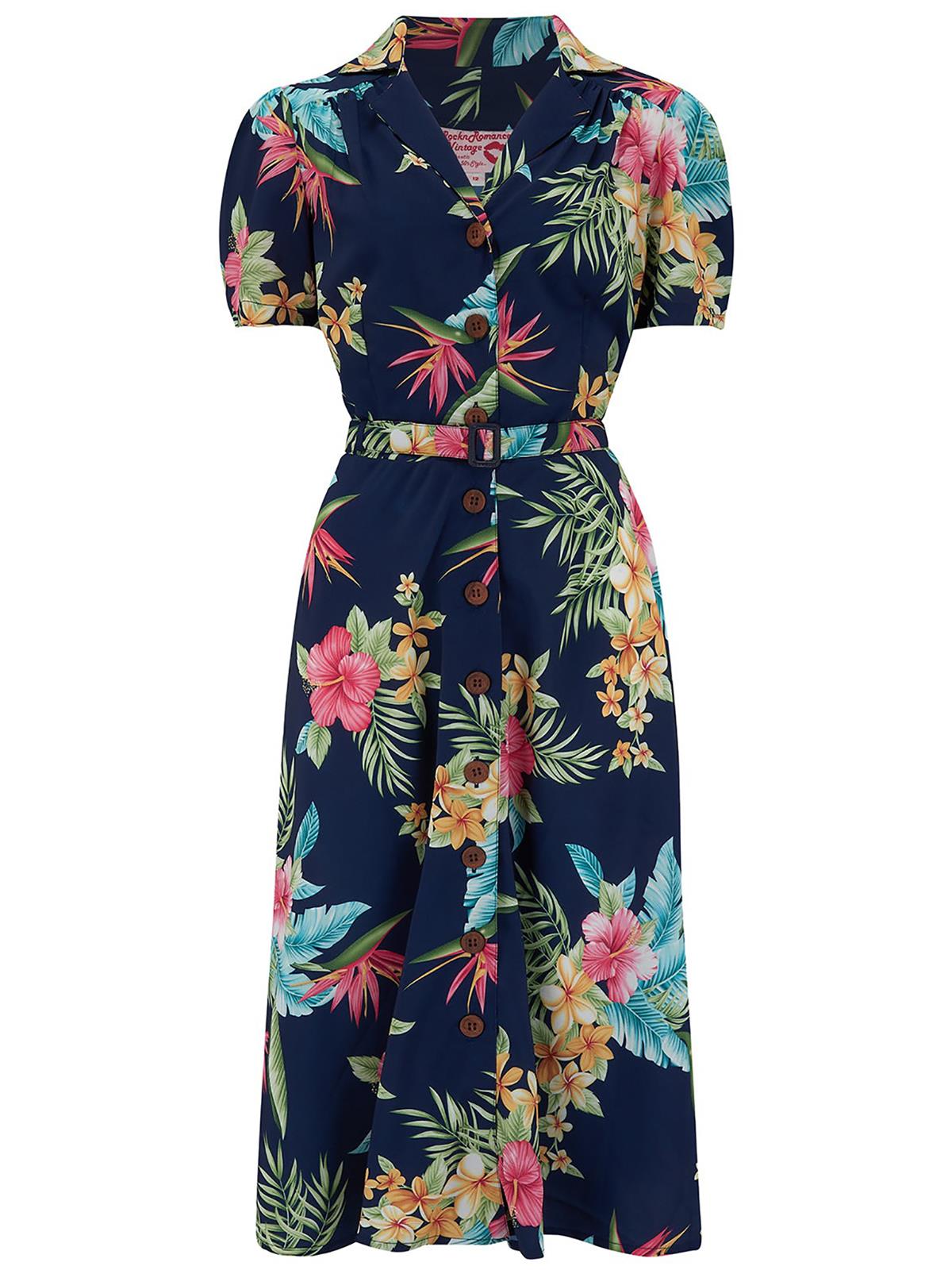 This tropical print retro-style shirtwaister dress will keep you cool in the summer heat. The dress features high-quality wooden buttons, a feminine silhouette, and lightweight fabric that is both flattering and easy to wear. The cut features short sleeves and an A-line skirt hemmed approximately below the knee.