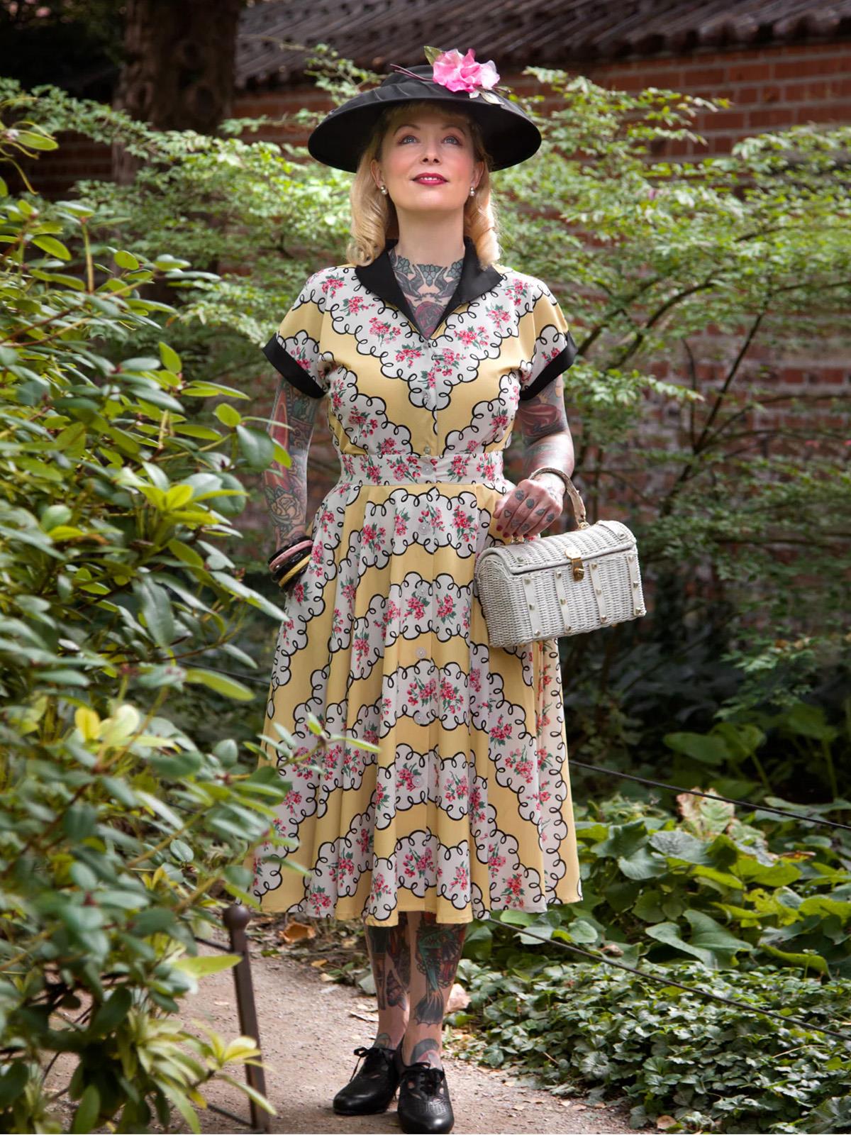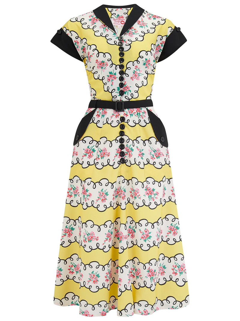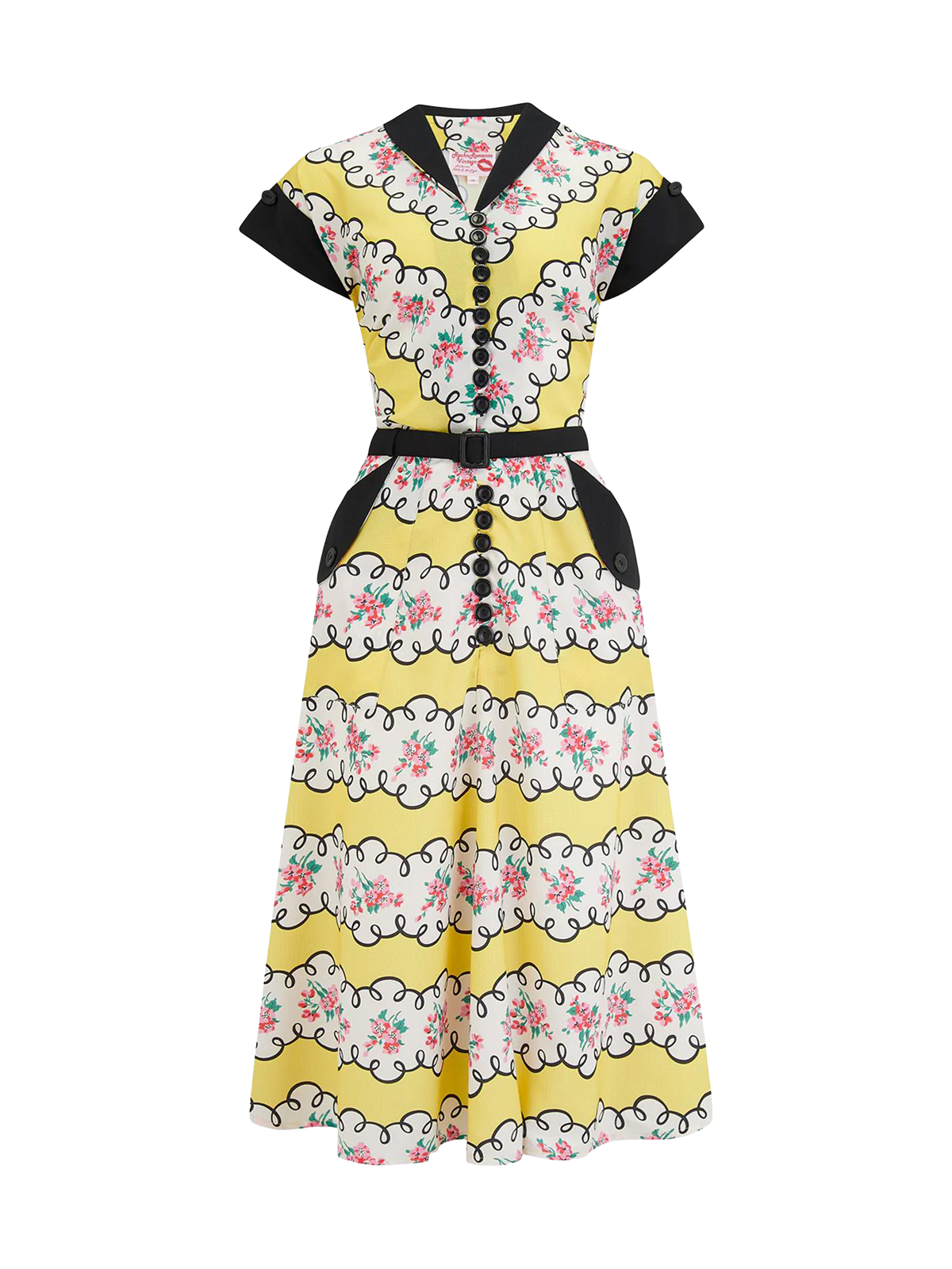 This lightweight 1950s-inspired dress in a black and yellow daydream floral print offers a flattering silhouette perfect for everyday wear.