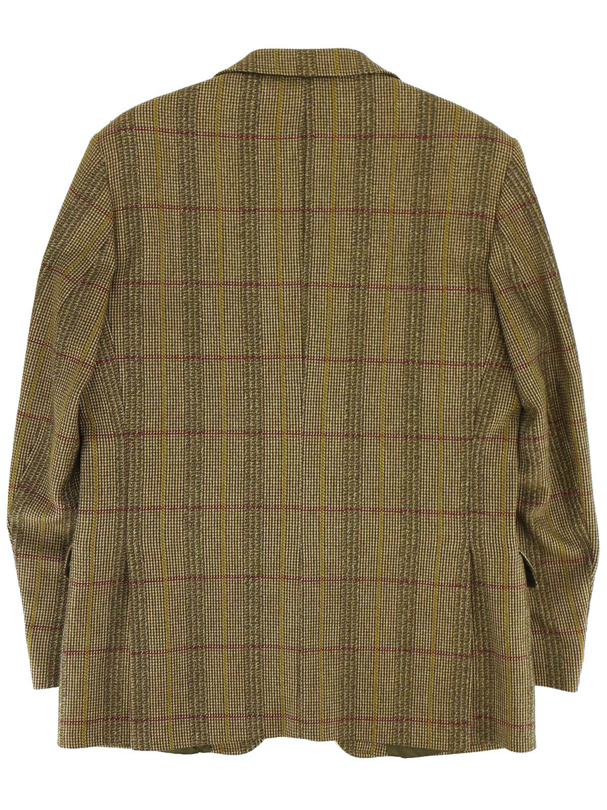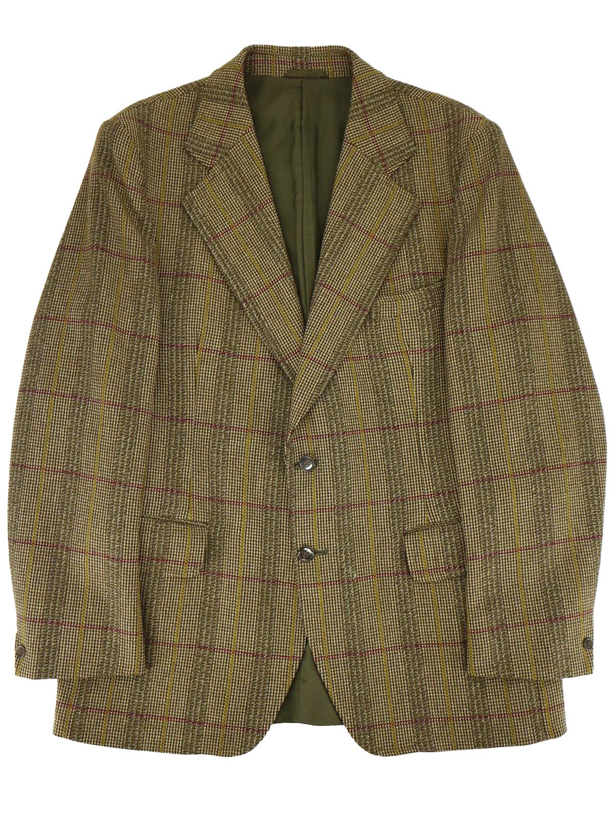 A classic addition to any vintage wardrobe, this pure new wool tweed jacket is realised in khaki tweed with a red and ochre check pattern.