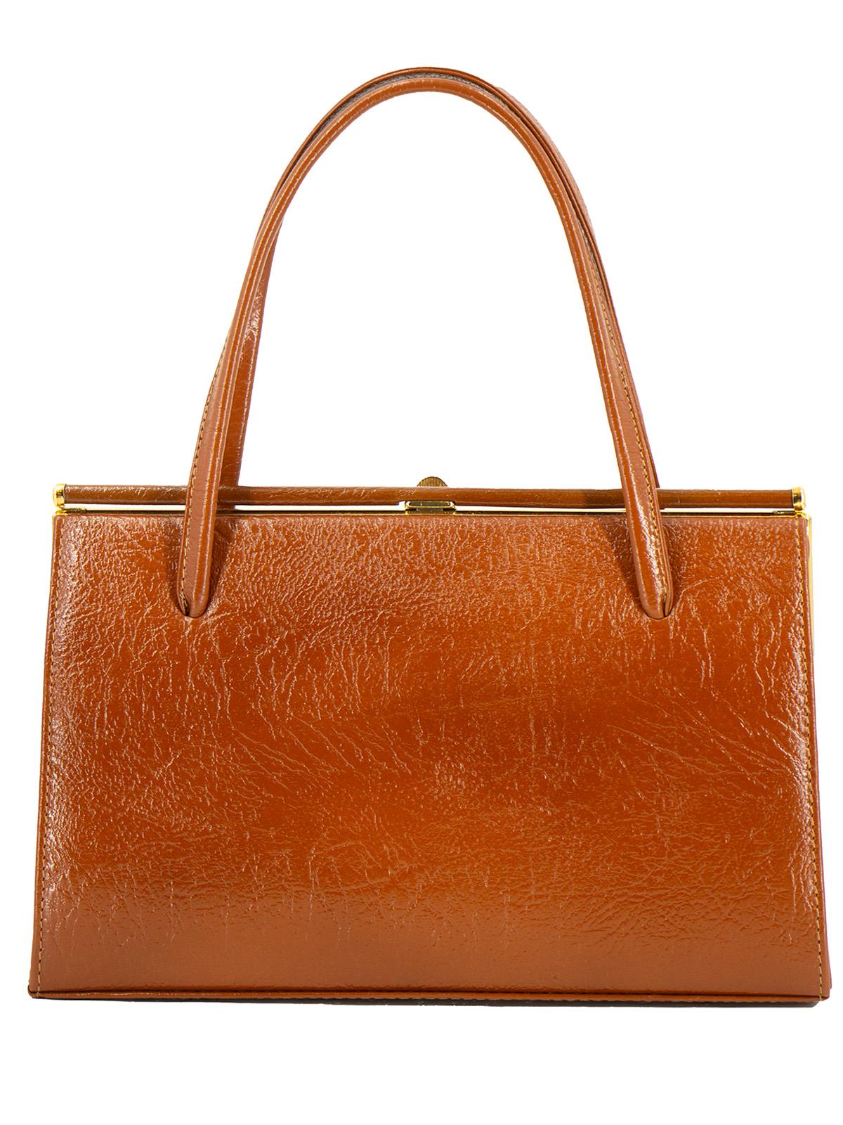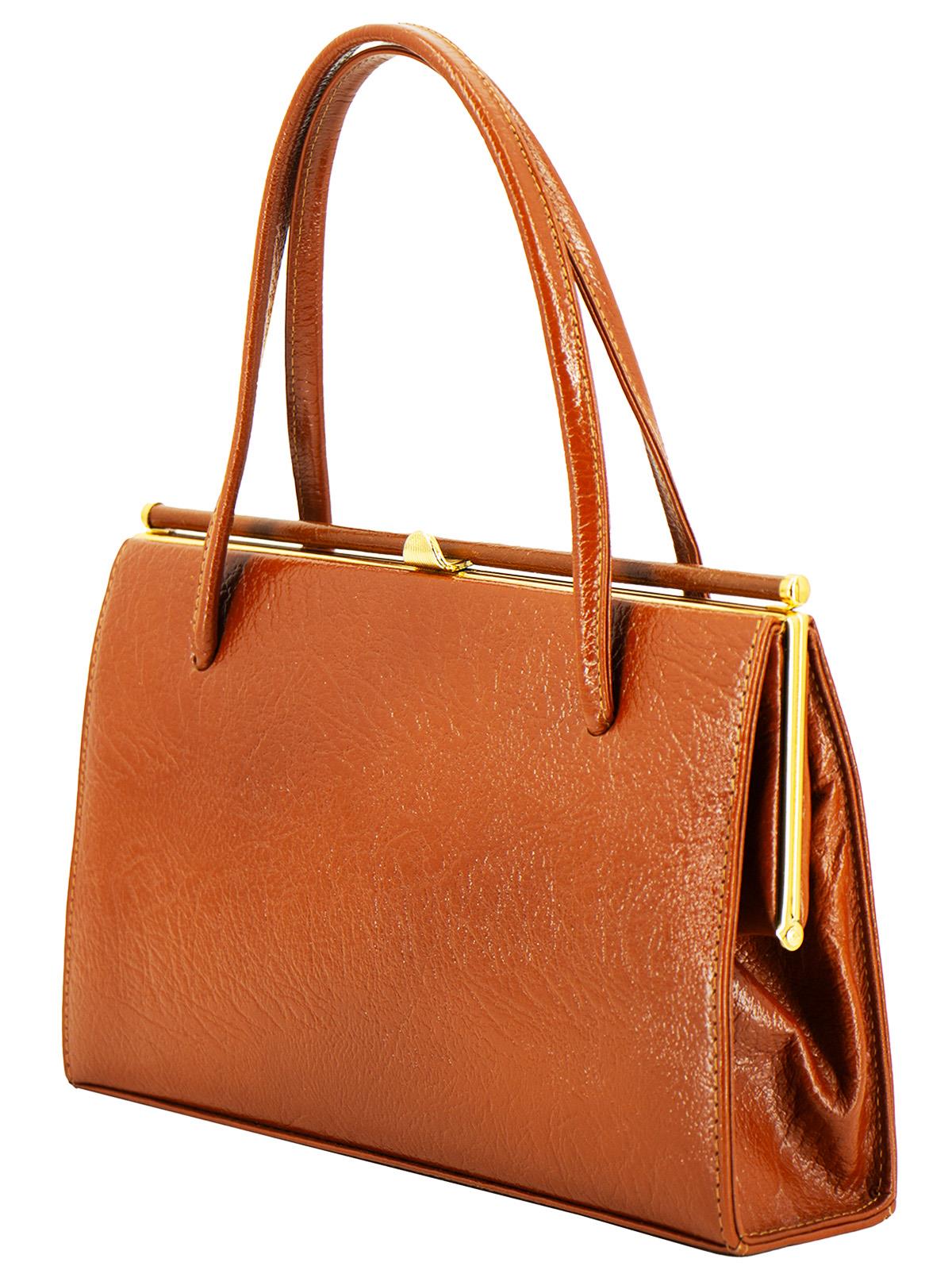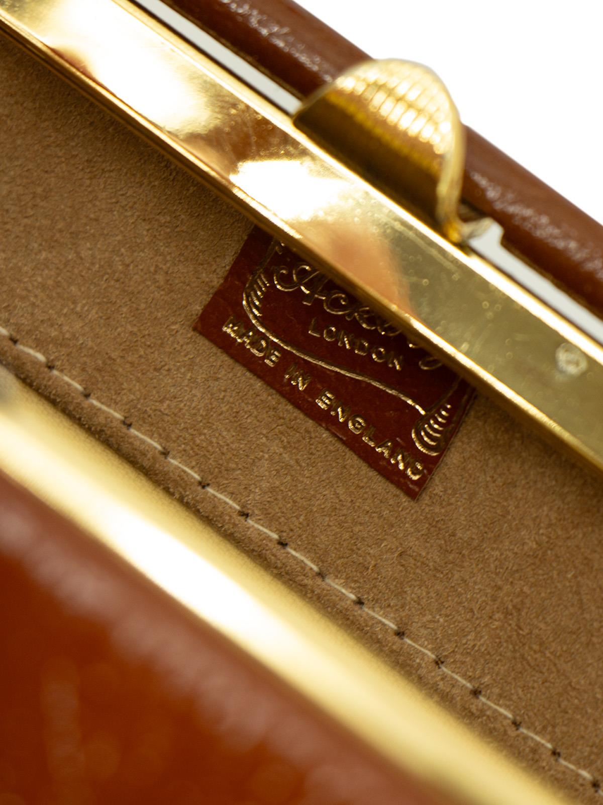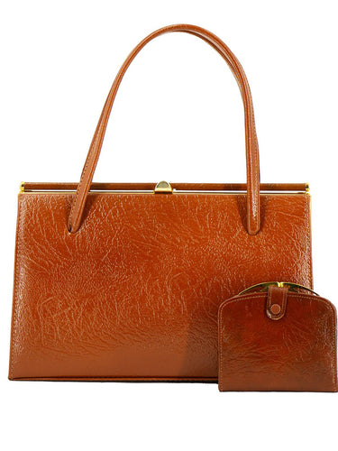 A wonderful mid-century example of a frame bag designed and made in England in a tan-coloured ("Oak Hide") textured patent leather with a matching purse.
