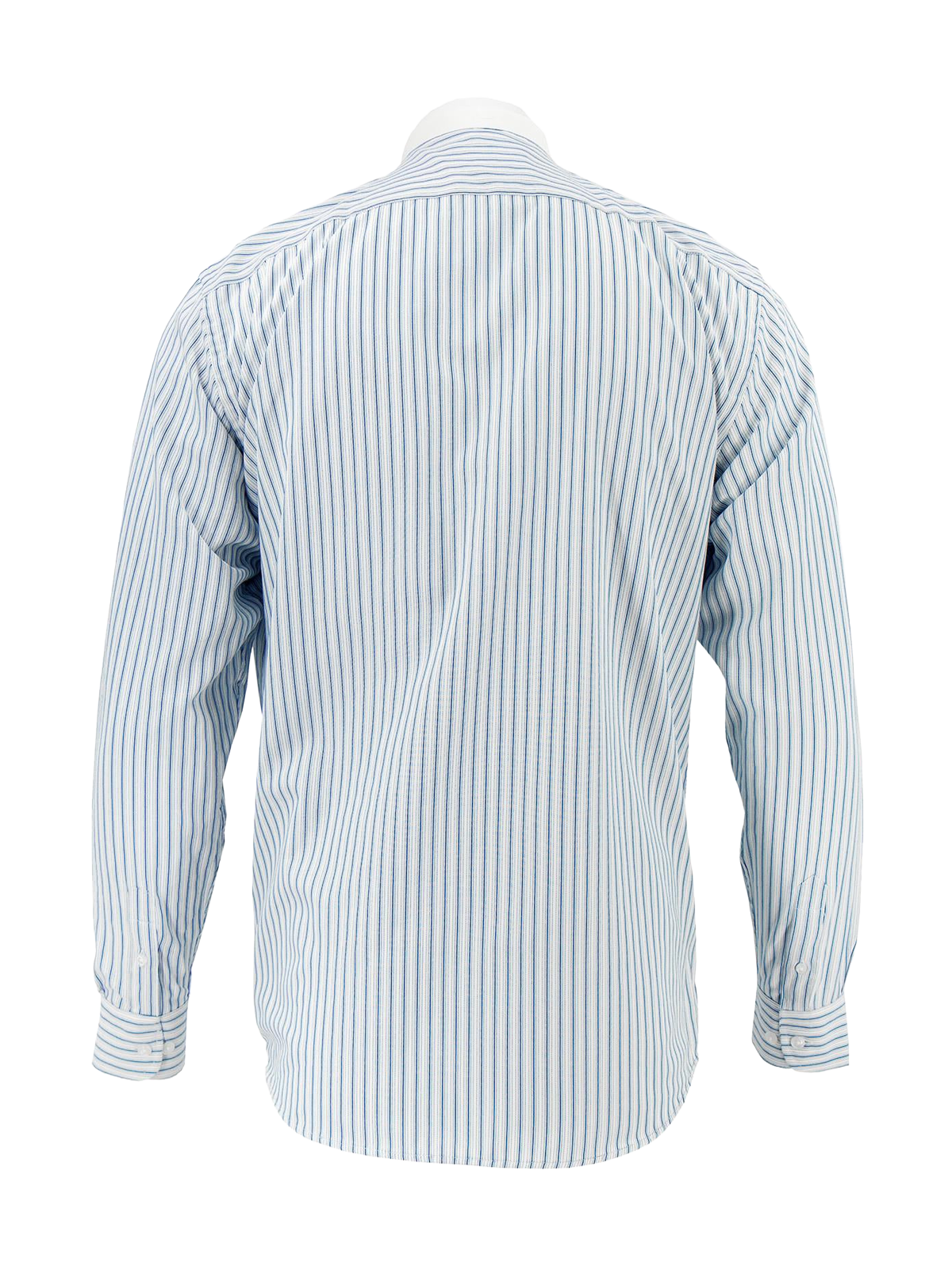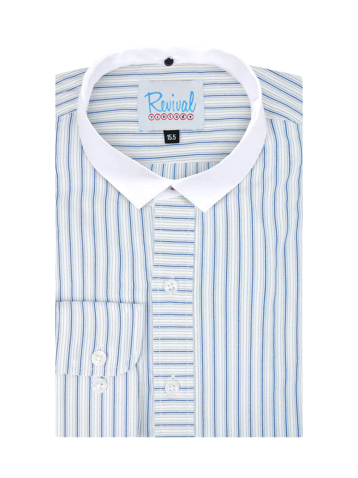 This Orton "grandad" shirt features a subtle navy blue stripe, exclusive to our brand, and comes with a white detachable banker collar. The shirt has two buttonholes in the neck to attach the included white collar, swap it out for another style (available separately), or to wear without for a more casual 1930s - 1940s look. The classic shirt is a versatile staple for any vintage wardrobe and compliments a range of retro outfits.