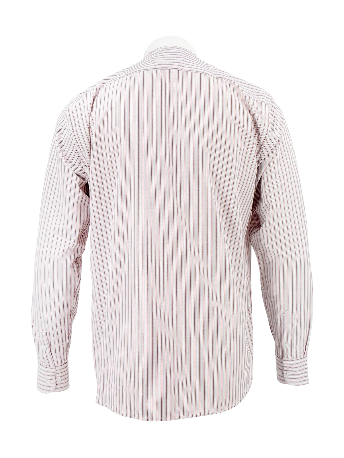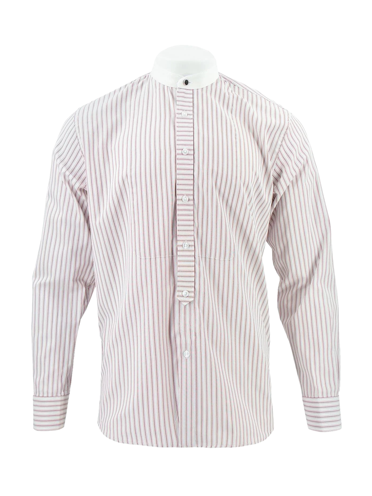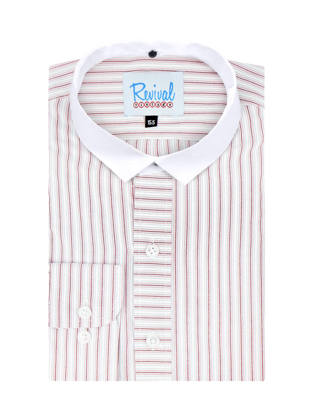 Our Red Stripe Orton "grandad" shirt is available here with a white detachable banker collar. The shirt has two buttonholes in the neck to attach the included white collar, swap it out for another style (available separately). This versatile shirt is easily accessorised with one of our Newsboy caps for a more casual 1930s - 1940s look.