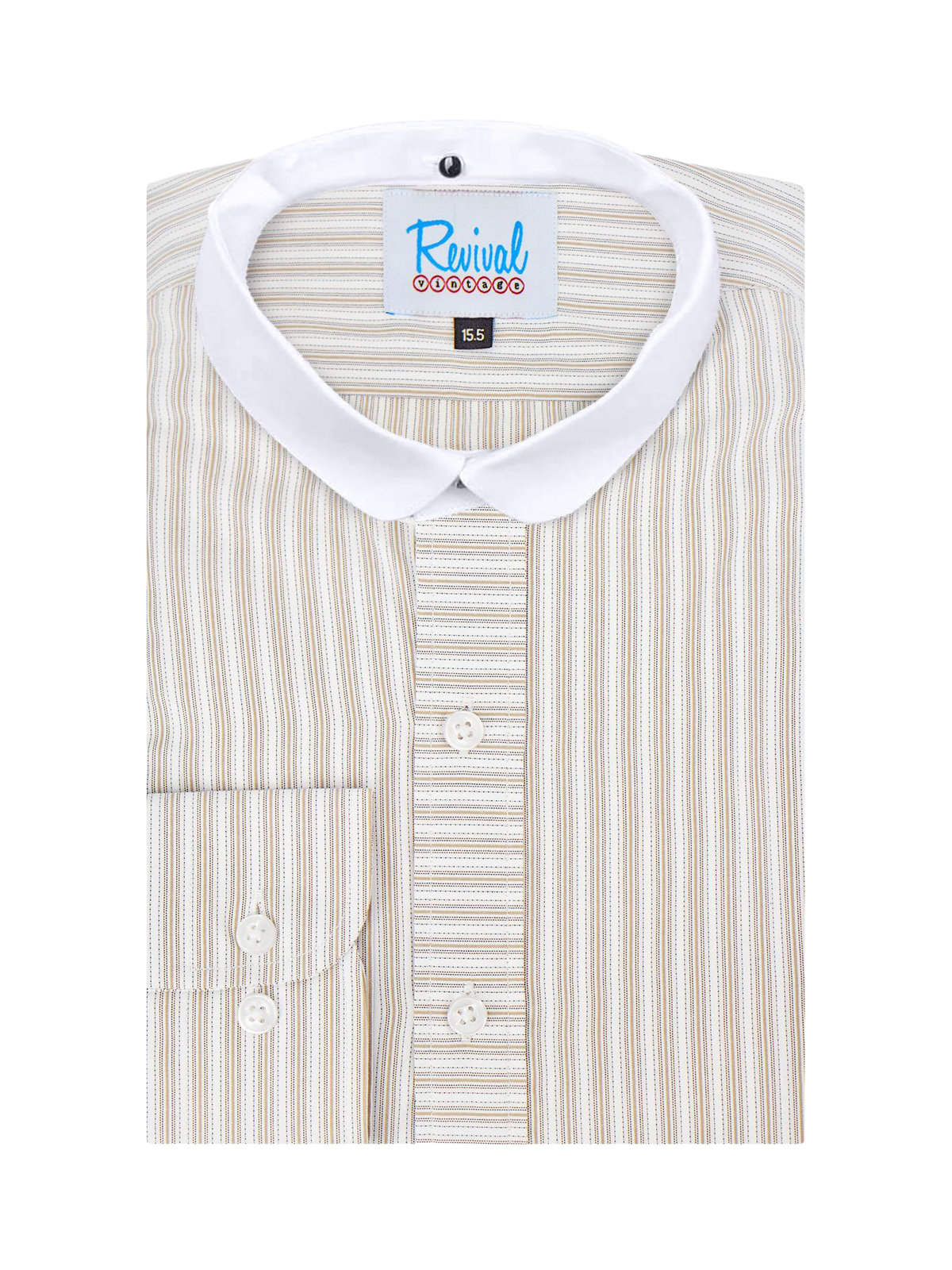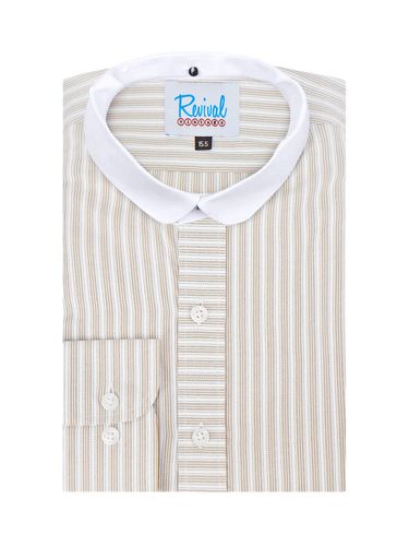 Our Revival-exclusive traditional brown stripe Orton collarless shirt is presented here with a white detachable club collar. The shirt has two buttonholes in the neck to attach the included white collar, swap it out for another style (available separately). This more casual 1930s - 1940s "grandad" shirt is a versatile staple for any vintage wardrobe.