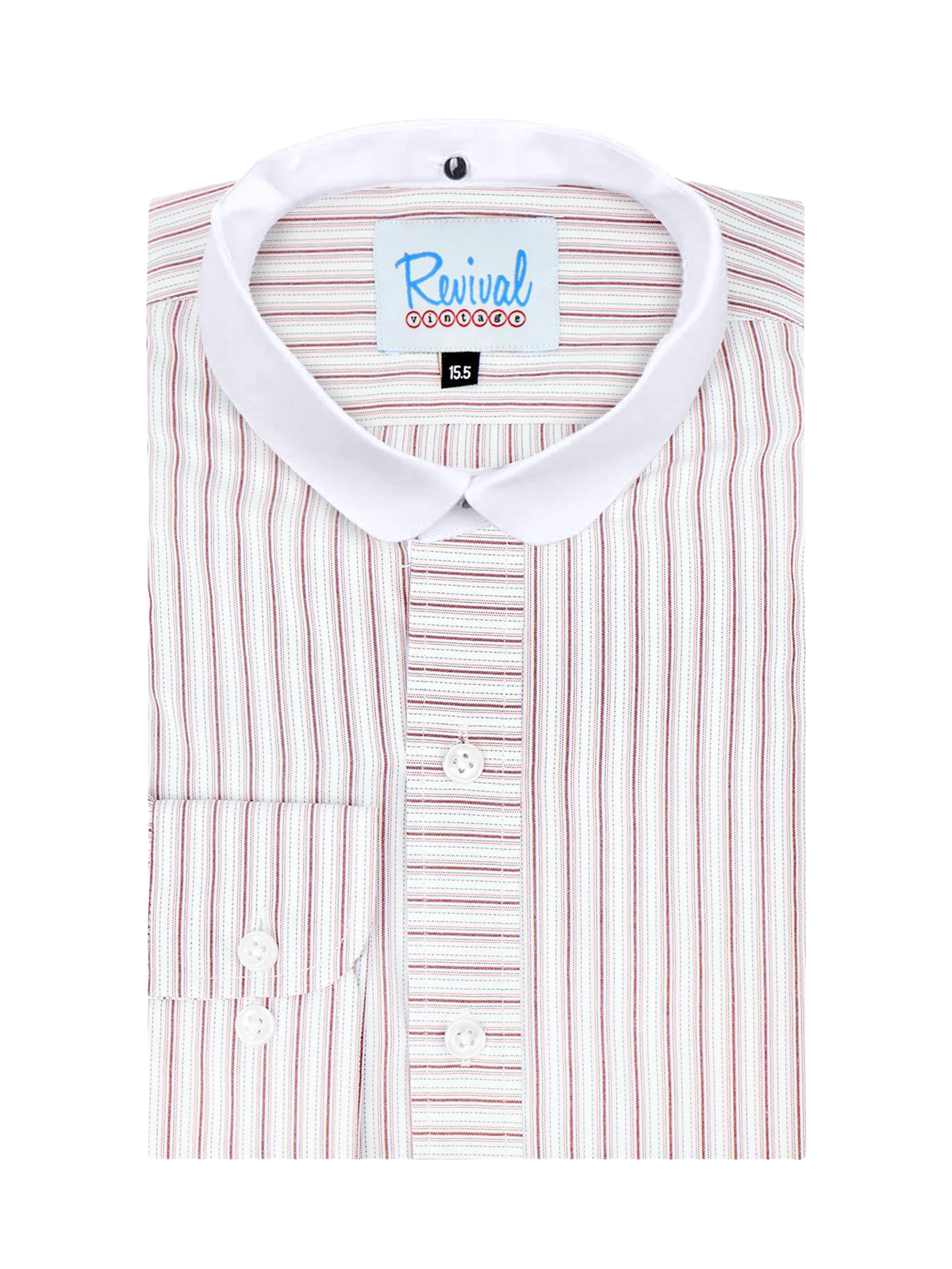 Our Orton "grandad" shirt is available here with a white detachable club collar, featuring an exclusive red stripe. The shirt has two buttonholes in the neck to attach the included white collar, swap it out for another style (available separately). This classic "grandad" design is a staple for any vintage wardrobe which compliments a range of 1930s and 40s outfits.