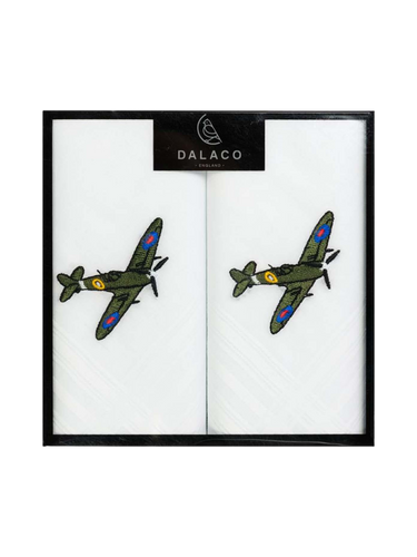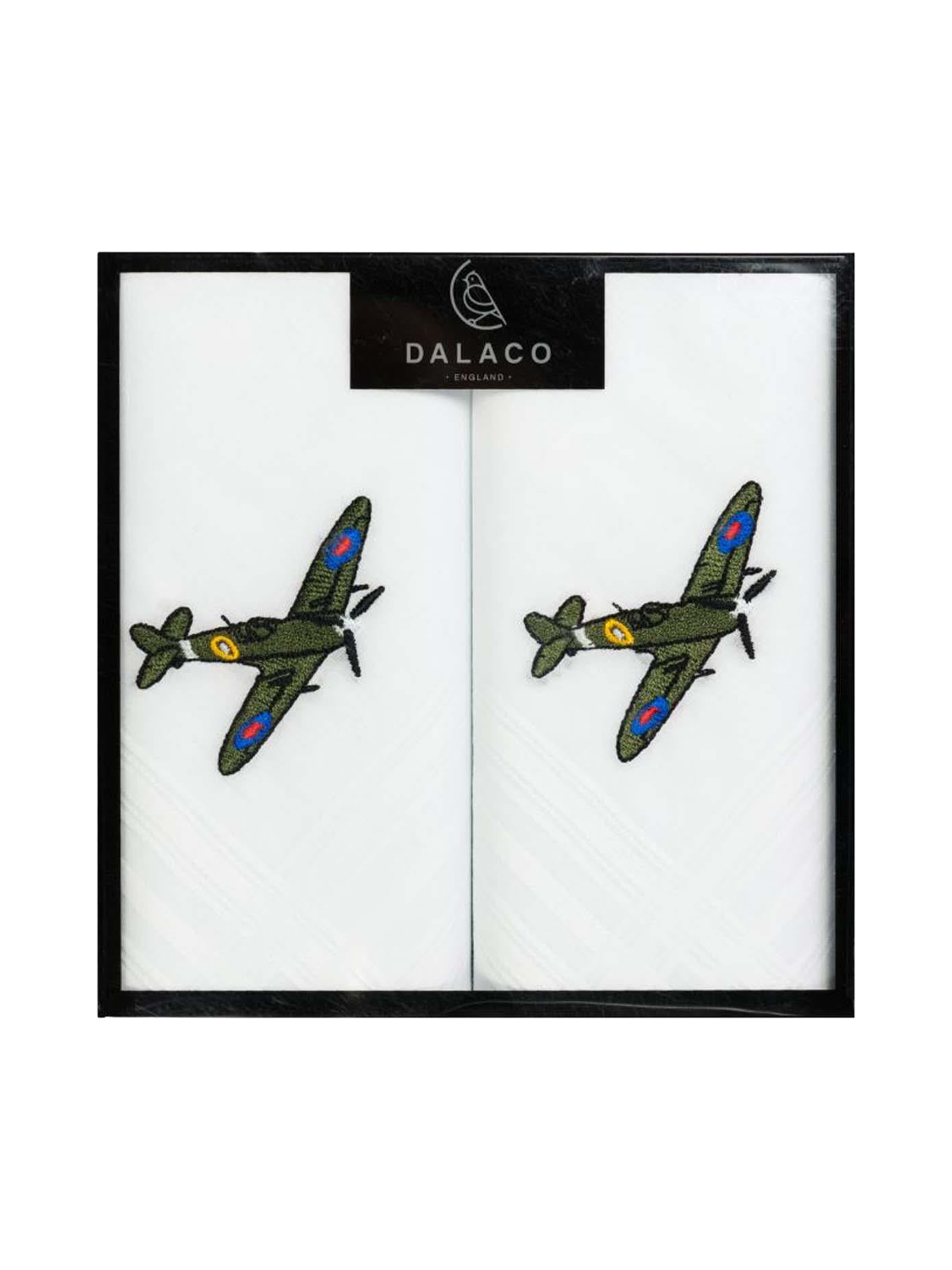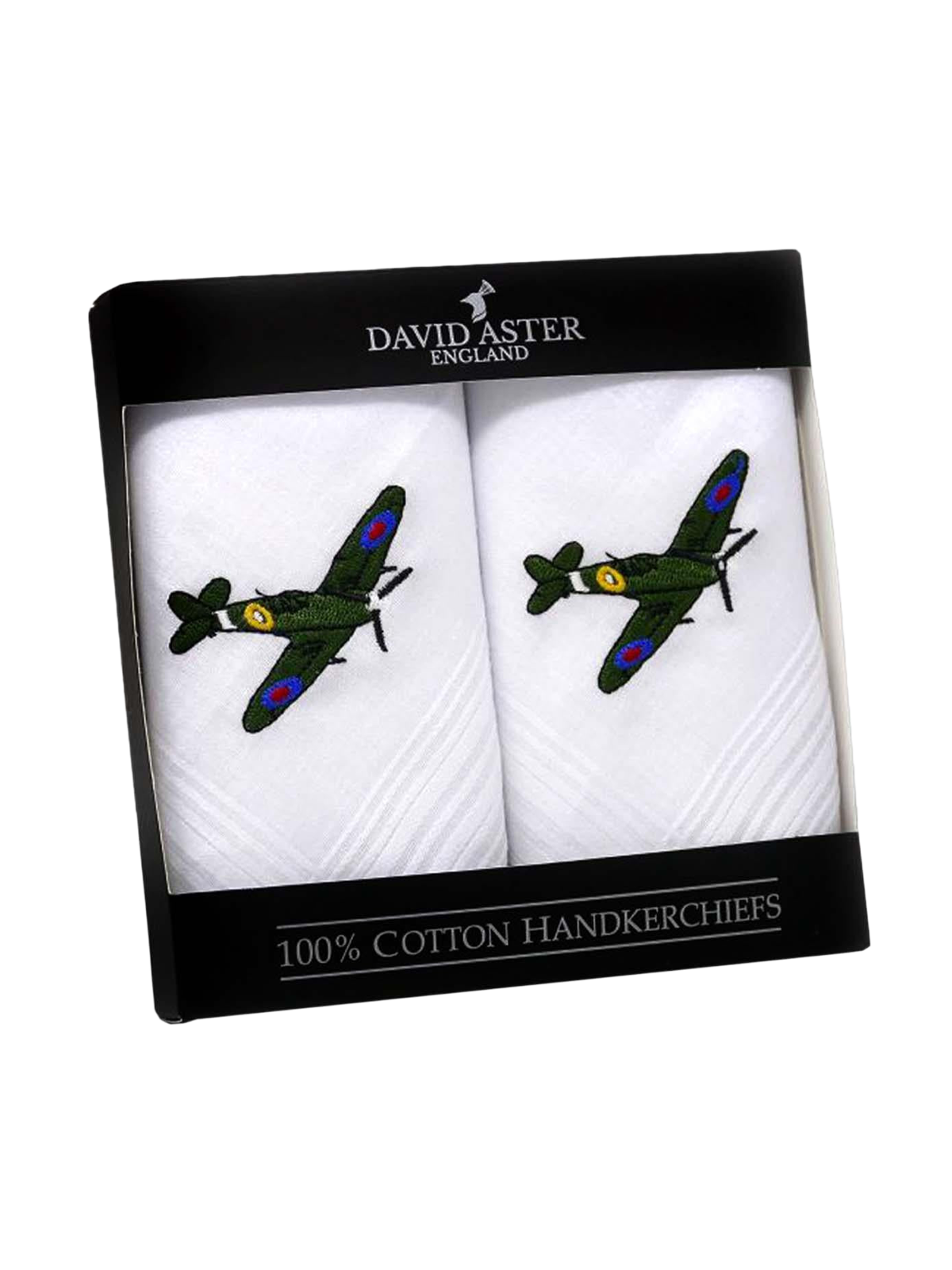 Two 1940s style white handkerchiefs, embroidered with spitfire airplanes.