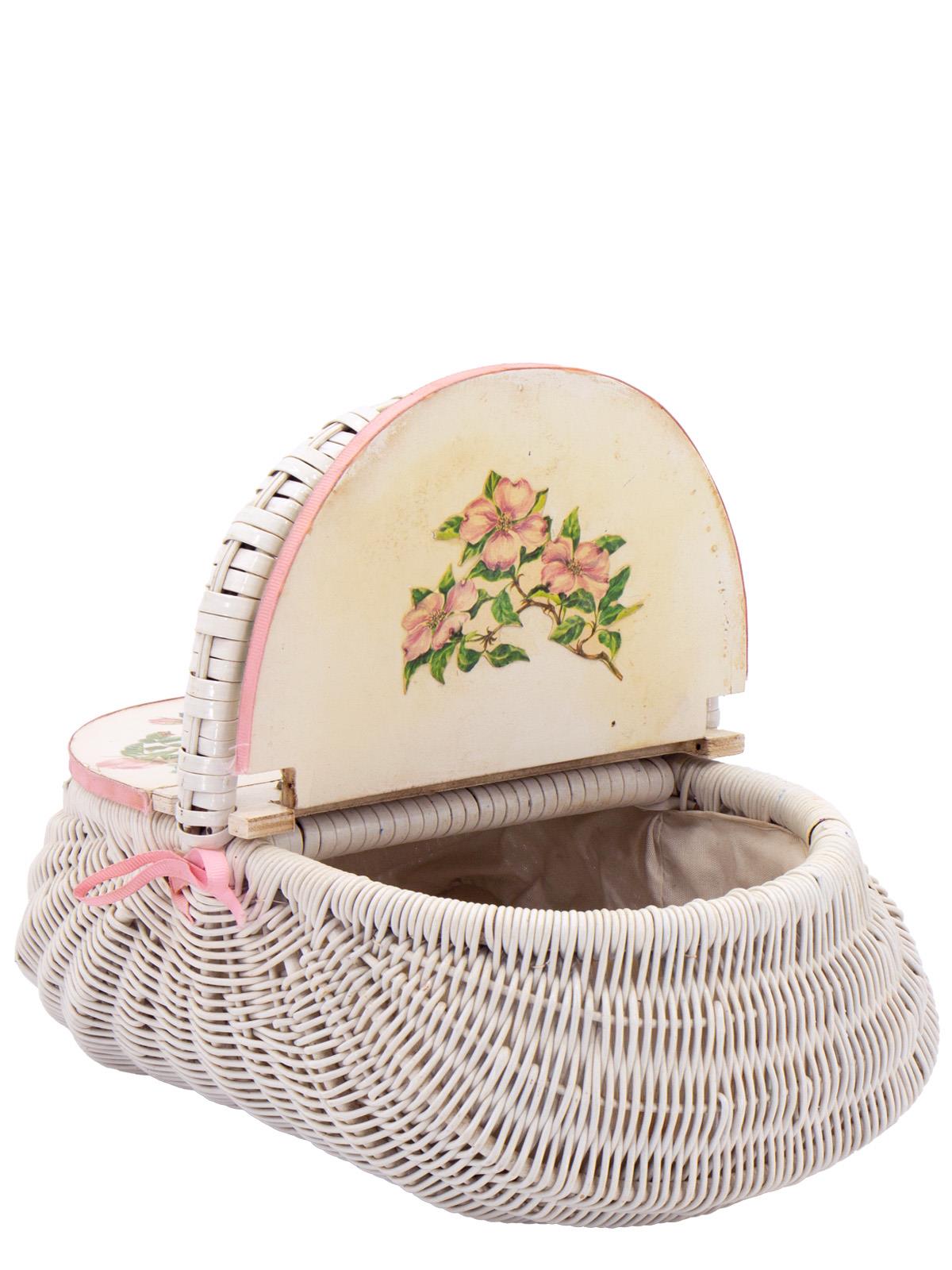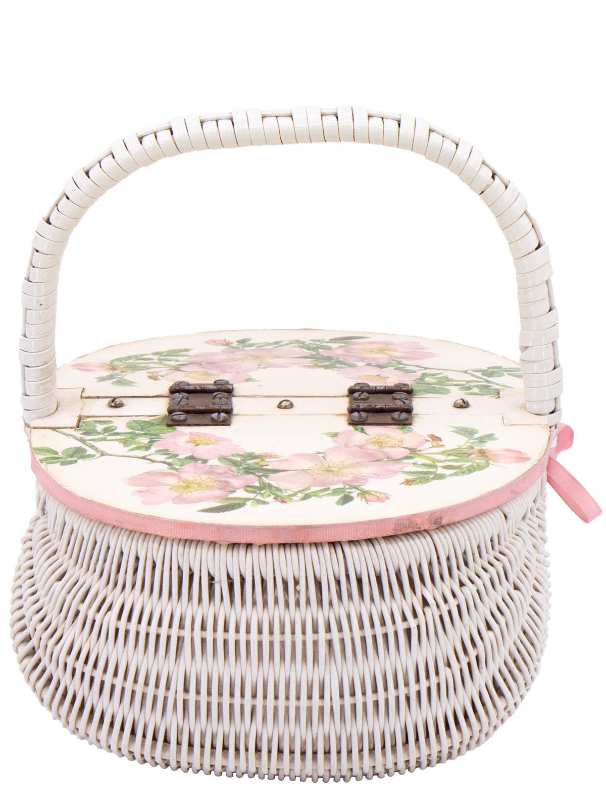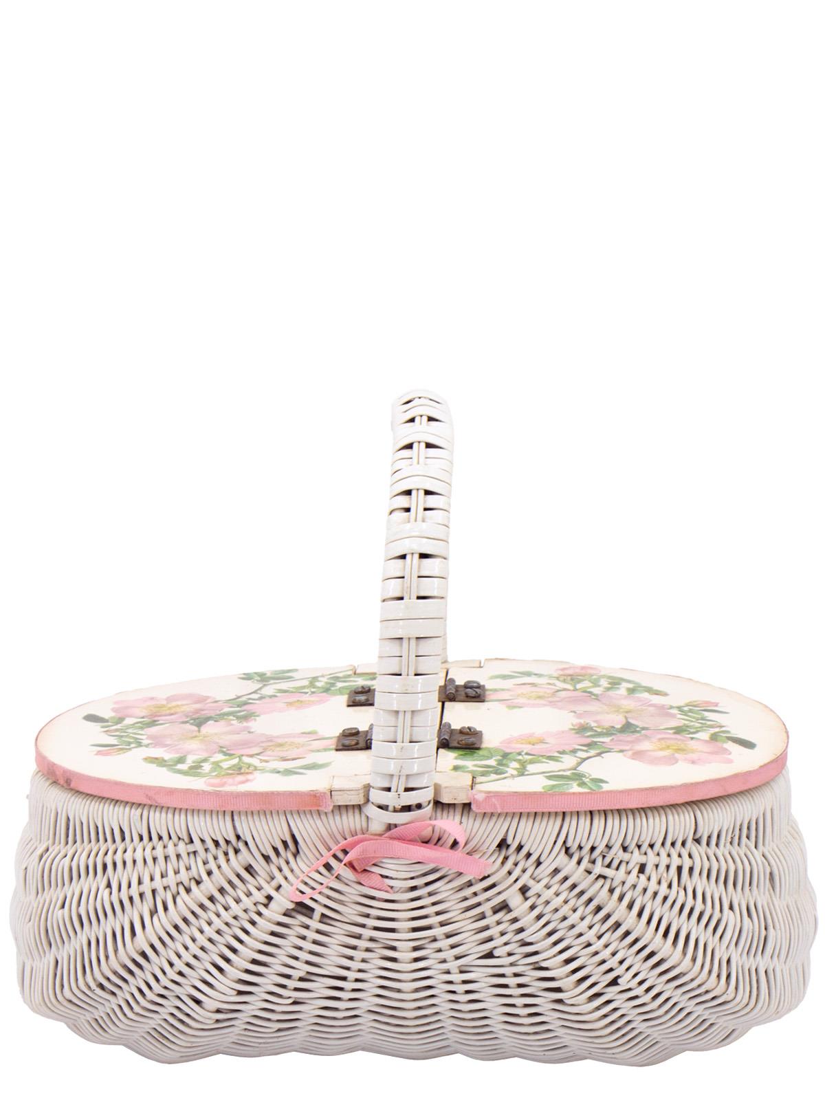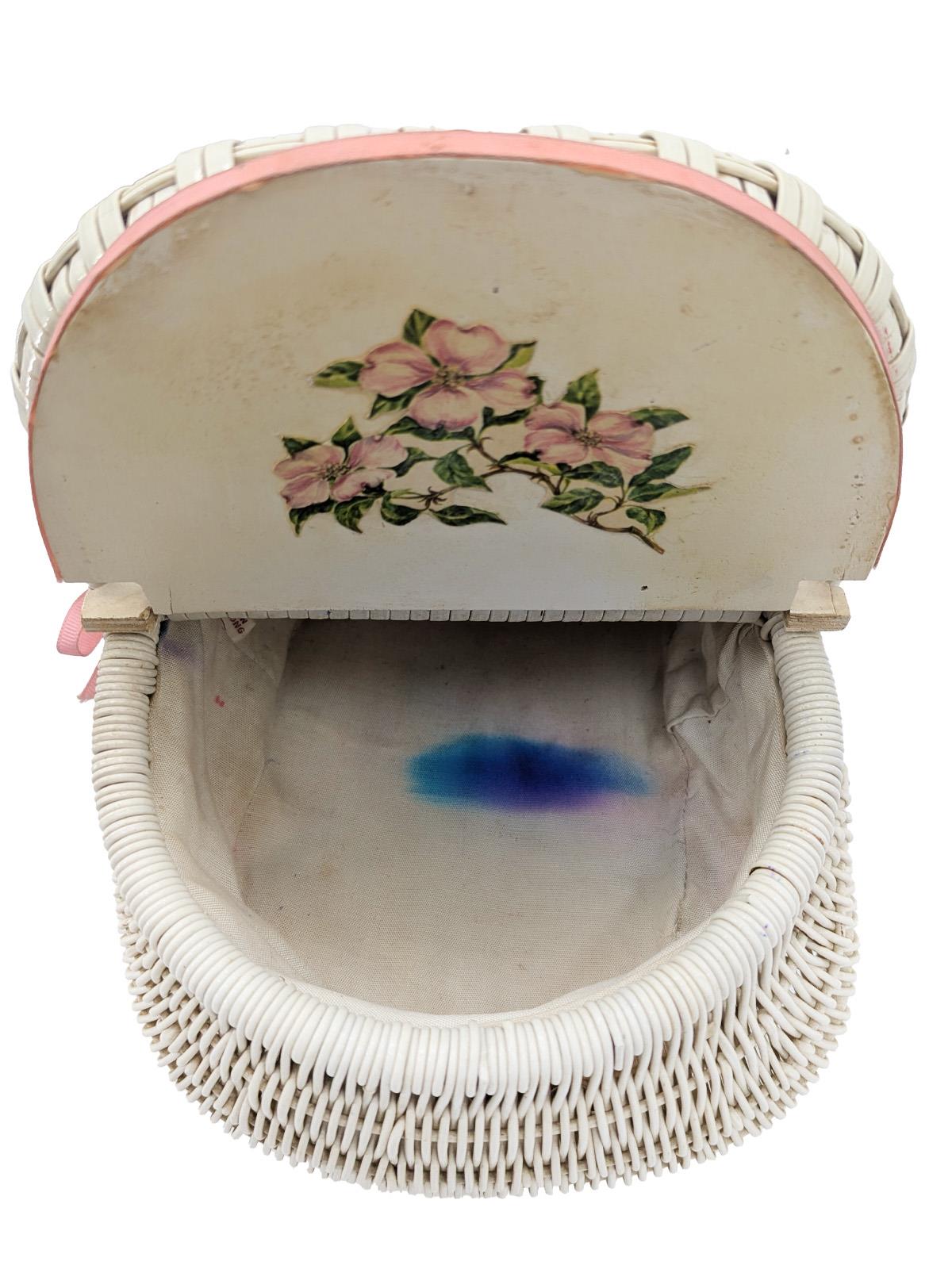 Solid white wicker basket with a double hinged wooden lid. Single fixed handle.