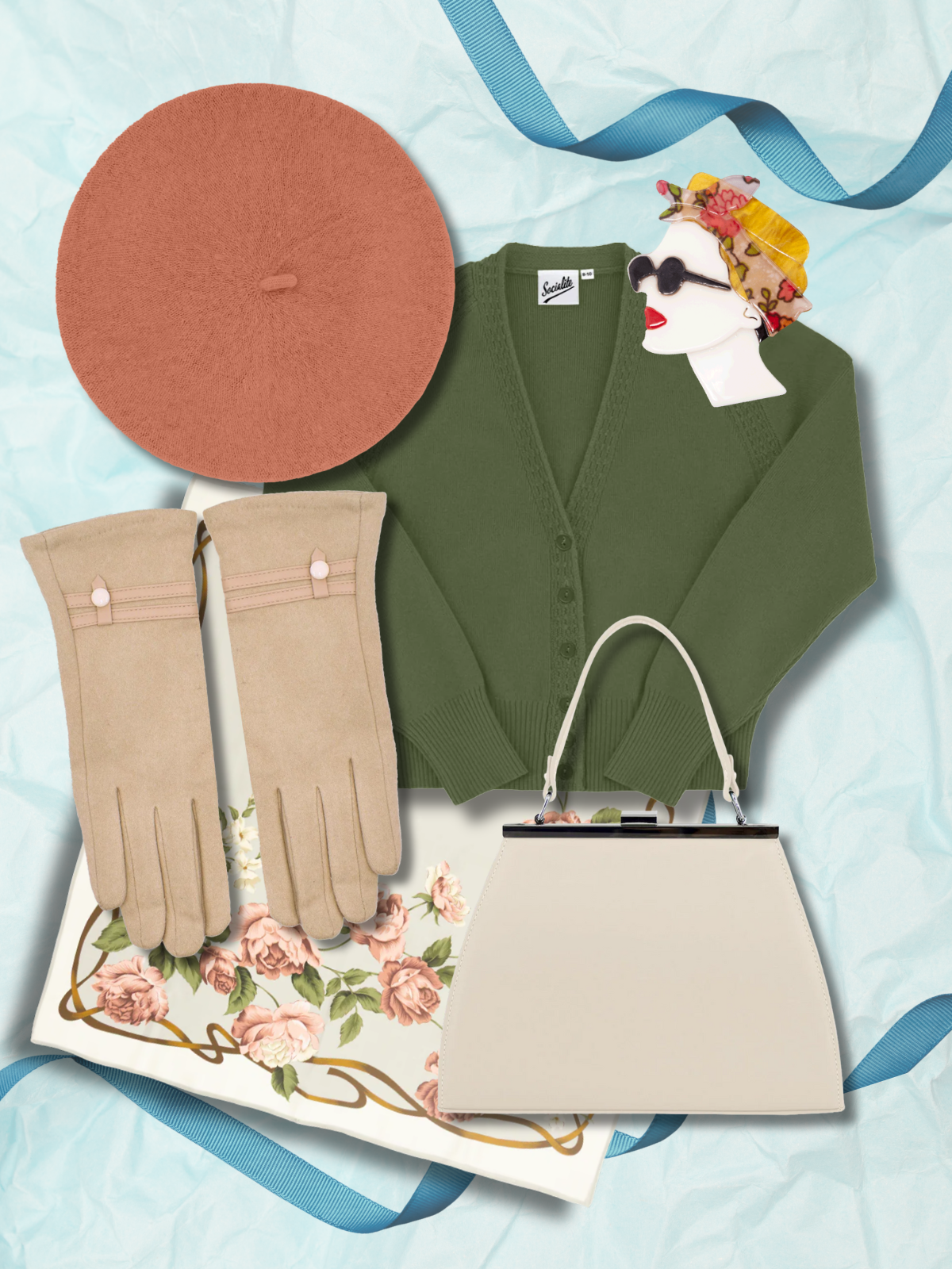 Thoughtfully selected for charm, quality, and style, this set includes our Daydream cardigan in allotment green, the Yesteryear handbag in fresh cream, a pure wool beret in rust brown, winter gloves in beige, a vintage style floral silk scarf in pink and cream and a retro pin up, acrylic brooch.