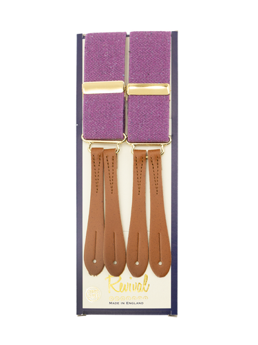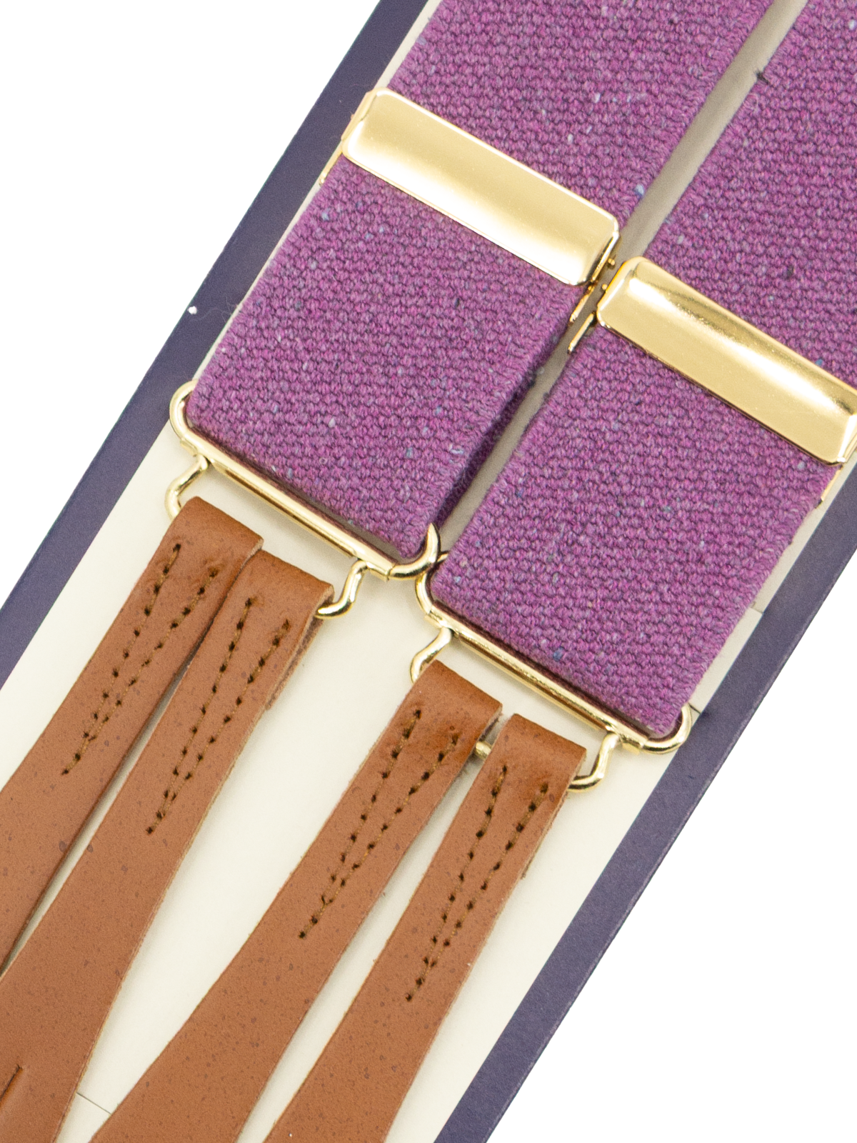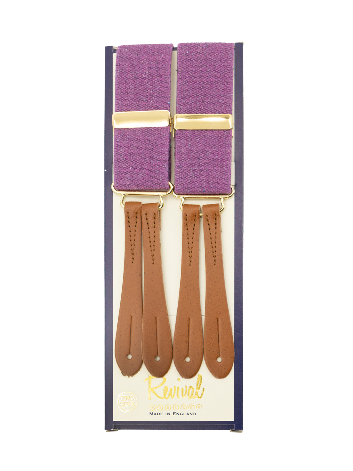 Premium quality, handmade, vintage style trouser braces, in heather purple and light blue fleck. With tan leather loops to attach to trousers with waist buttons.