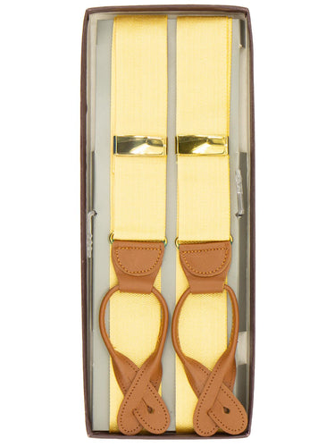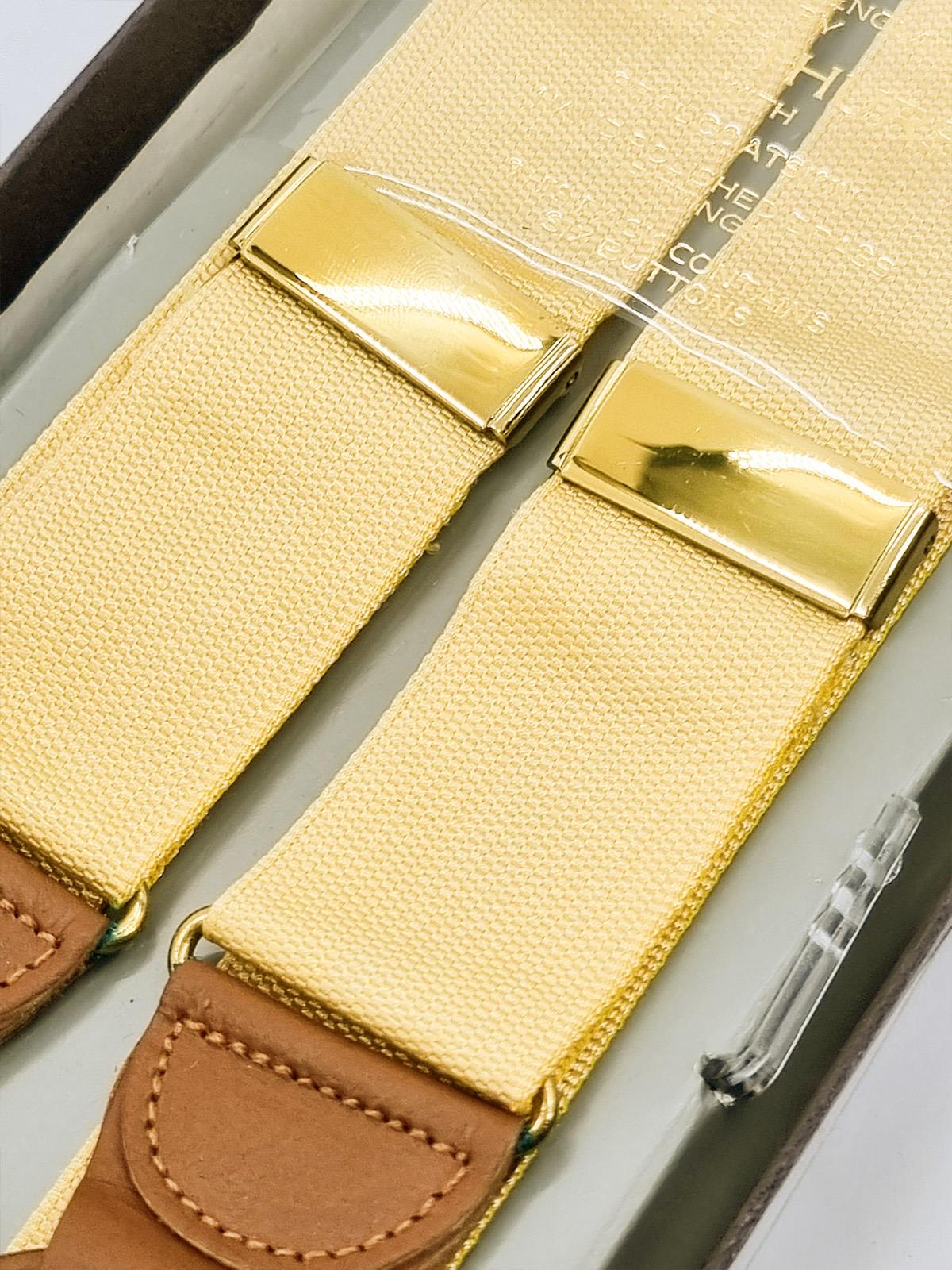 Lemon yellow with tan goat leather loops to attach to trousers with waist buttons.