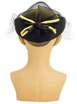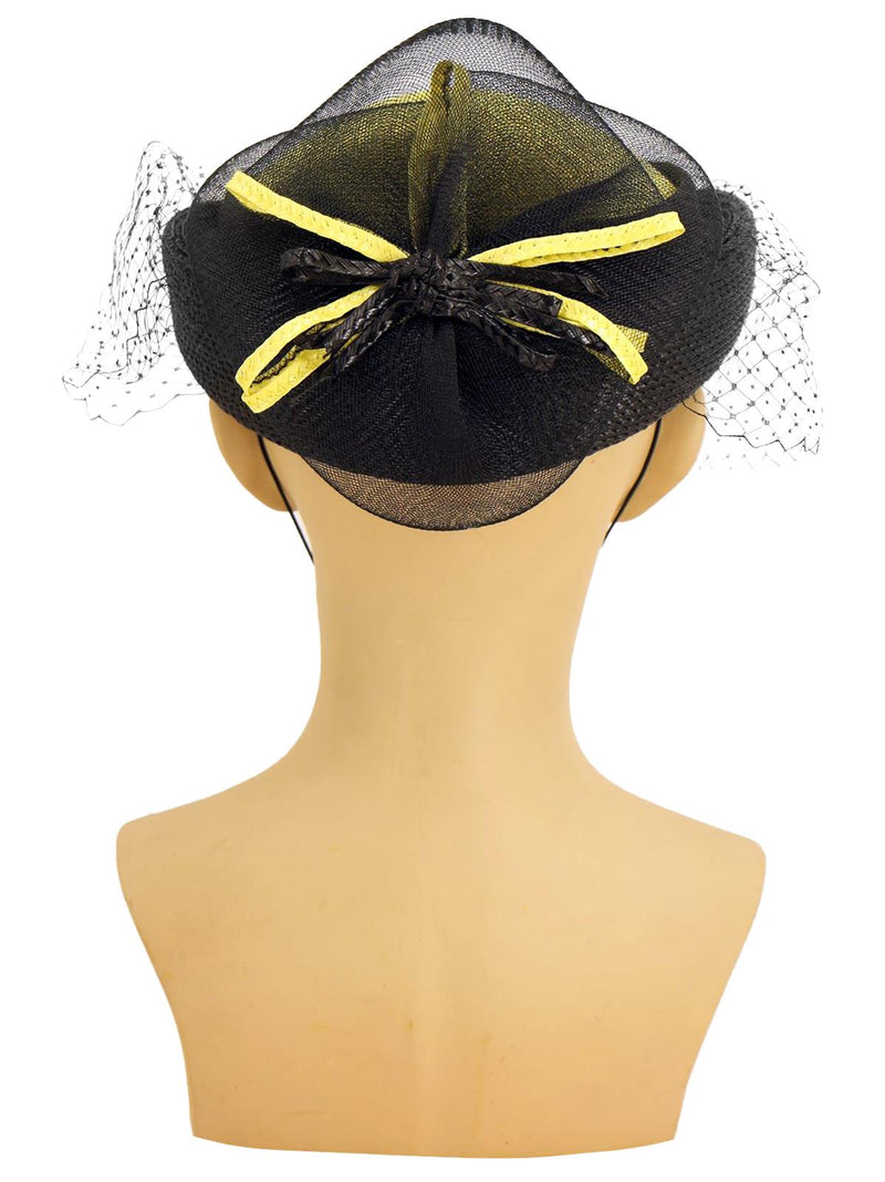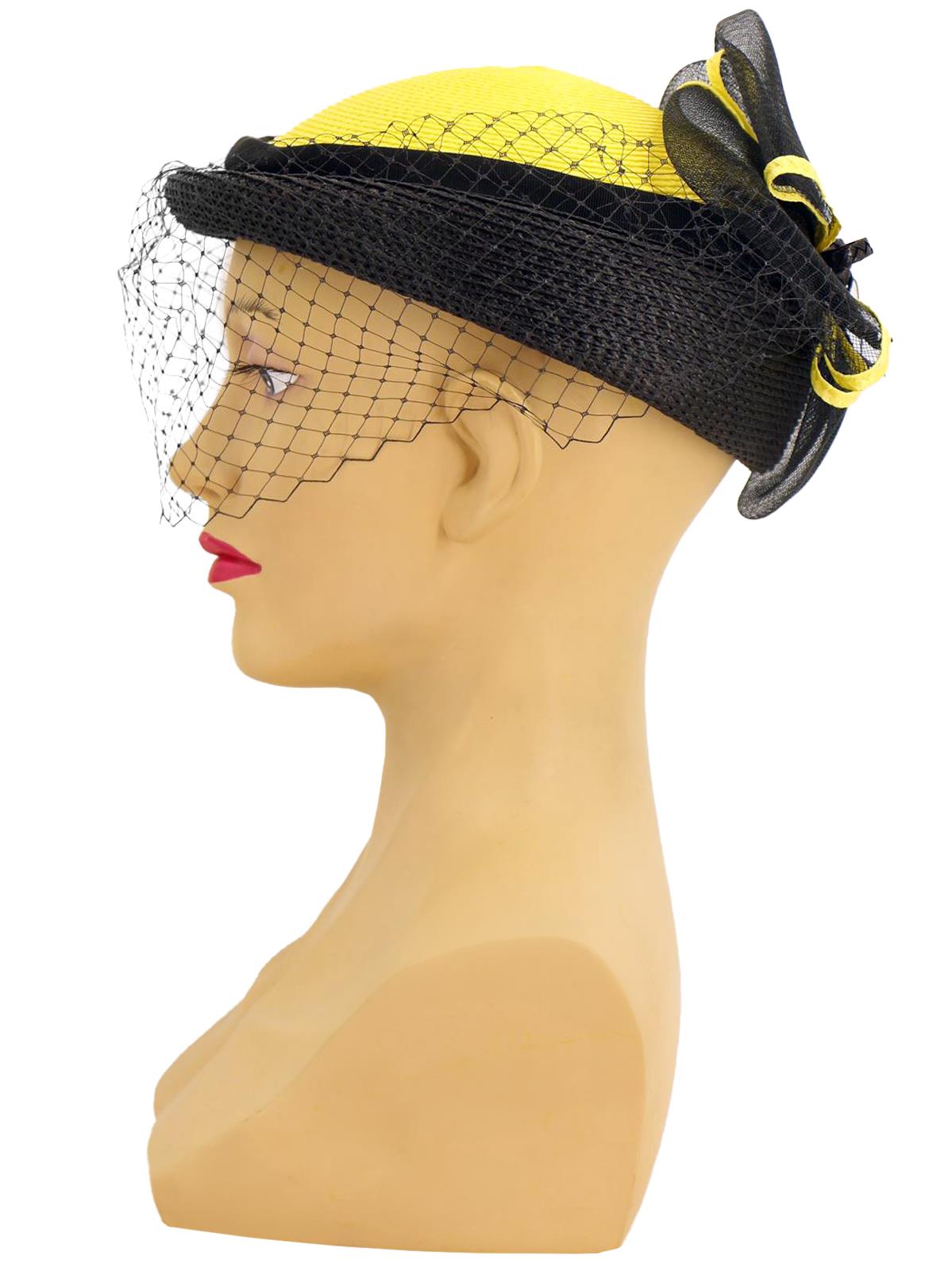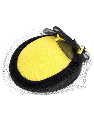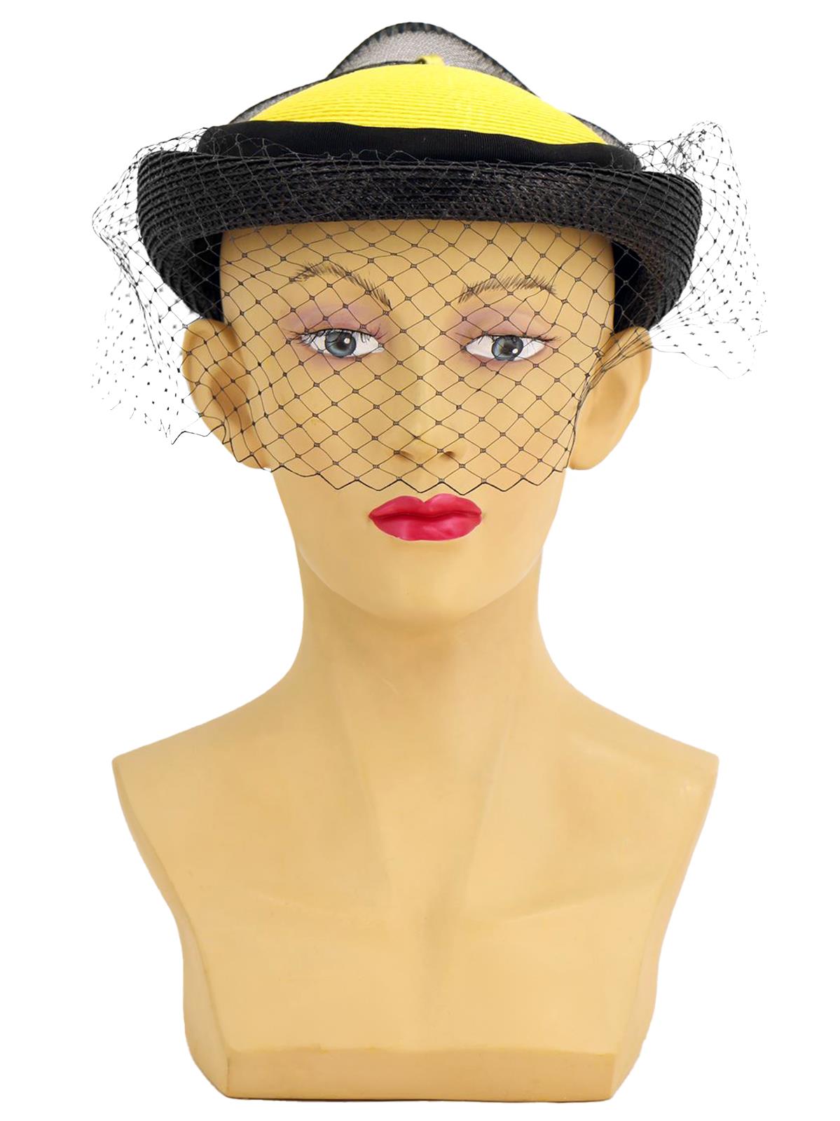 Vintage straw hat, made of contrasting yellow and black straw and featuring net decor. An eyecatching 80s does 40s piece.