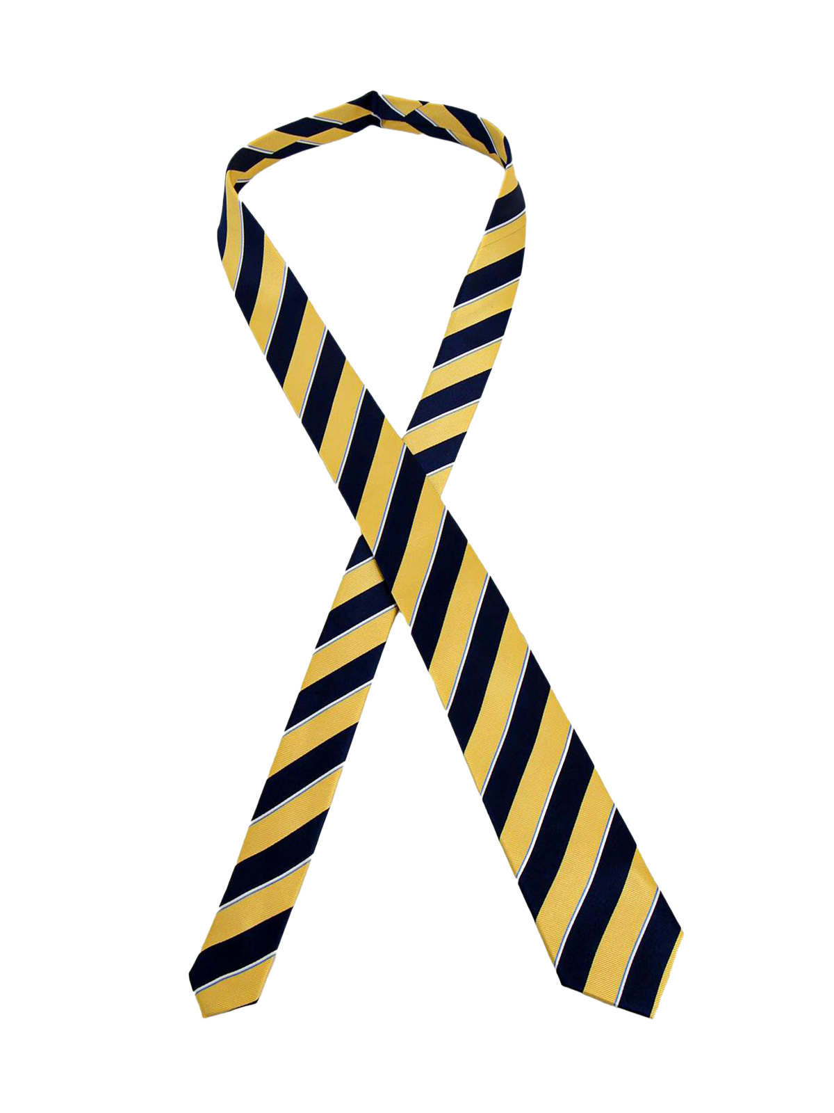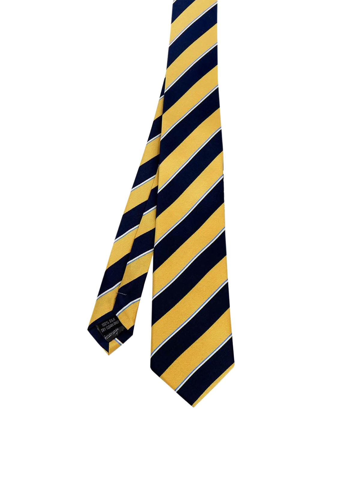 An vintage style silk necktie in a bold yellow and navy blue stripe pattern. A classic collegiate design that adds timeless flair to a retro inspired outfit. Made in the UK from pure silk.