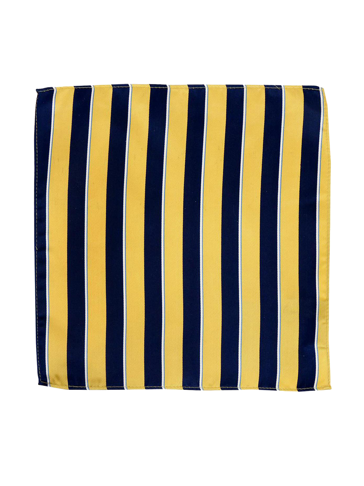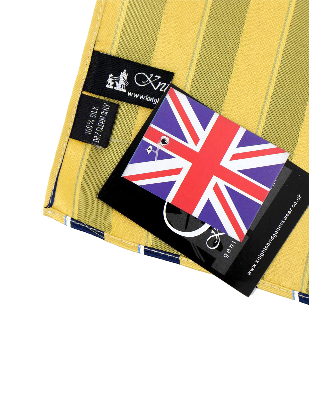 A vintage style silk pocket square in a bold yellow and navy stripe design. Handmade in England, it’s a refined accessory that adds a touch of charm to any jacket.