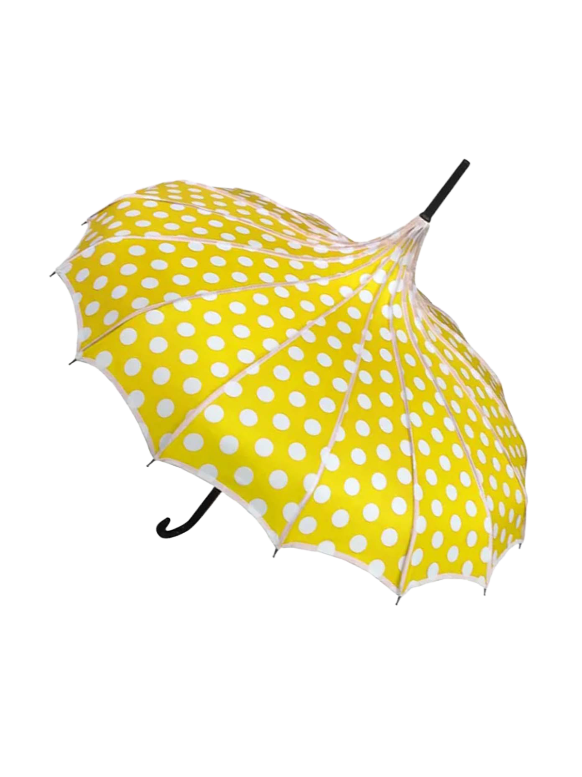 Timeless yellow polka dot pattern pagoda vintage look umbrella. Protect your vintage outfits in inclement weather with a perfectly complementary accessory.