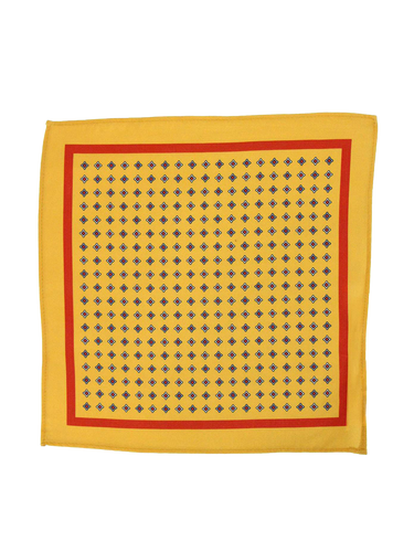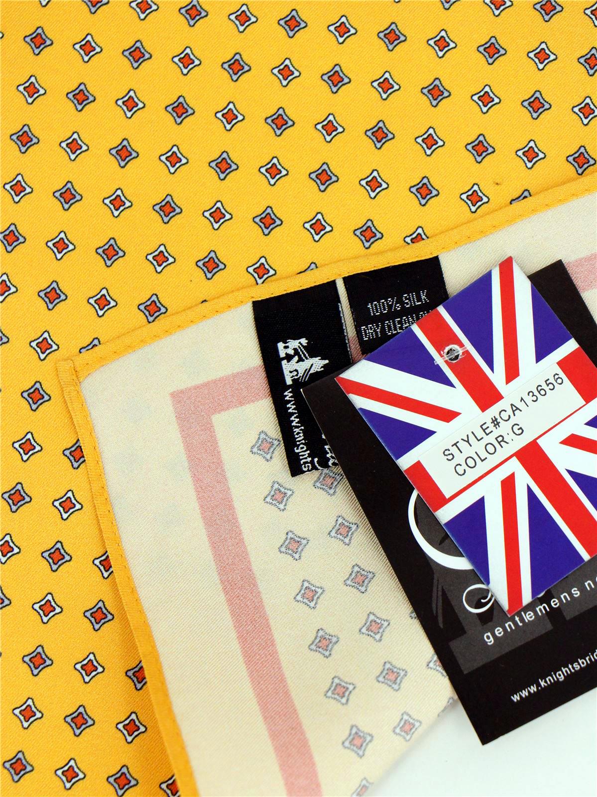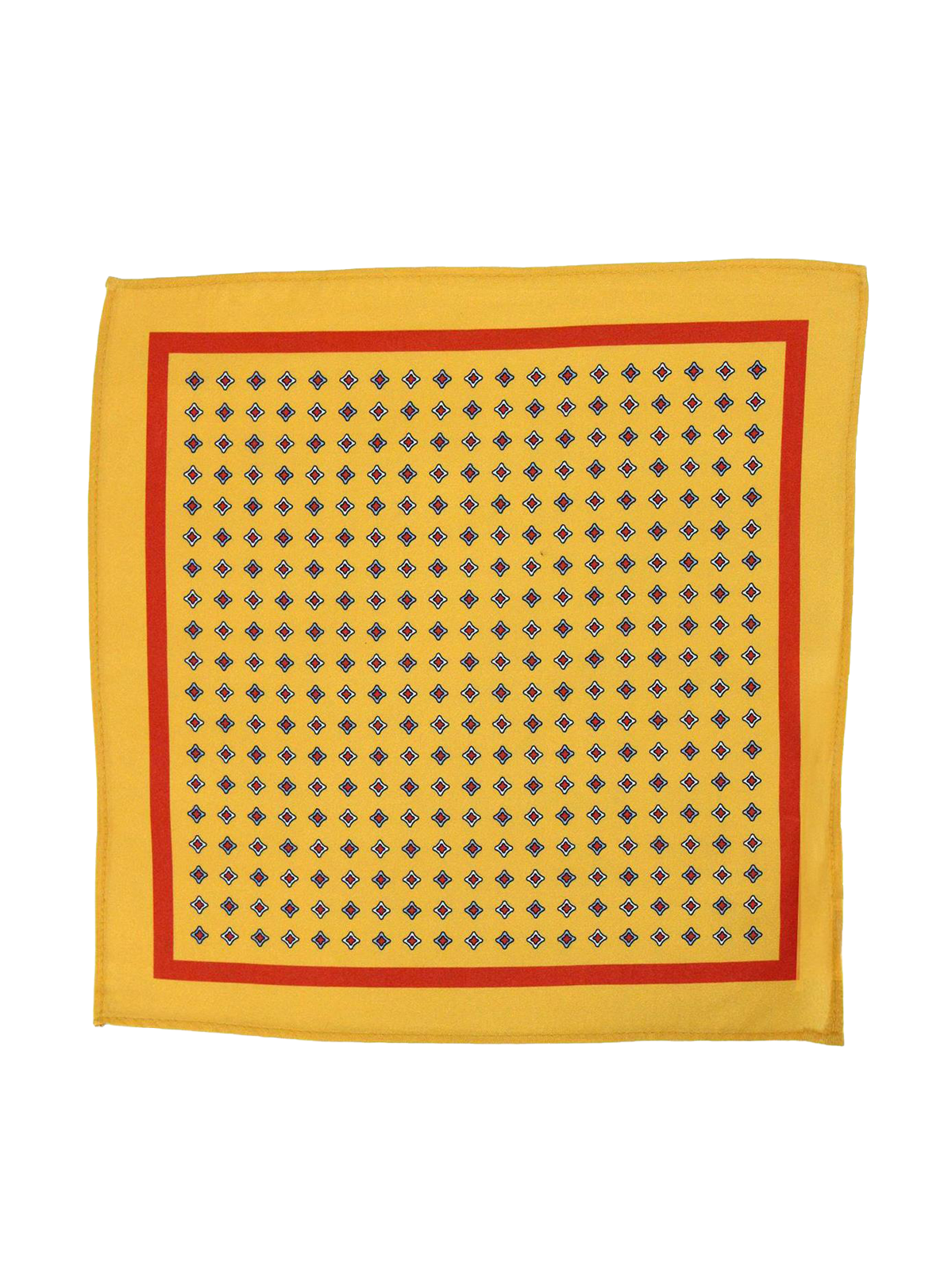 A classic British handmade 100% silk pocket square in a warm yellow and red diamond print. A cheeky pop of colour to add to your vintager breast pocket.